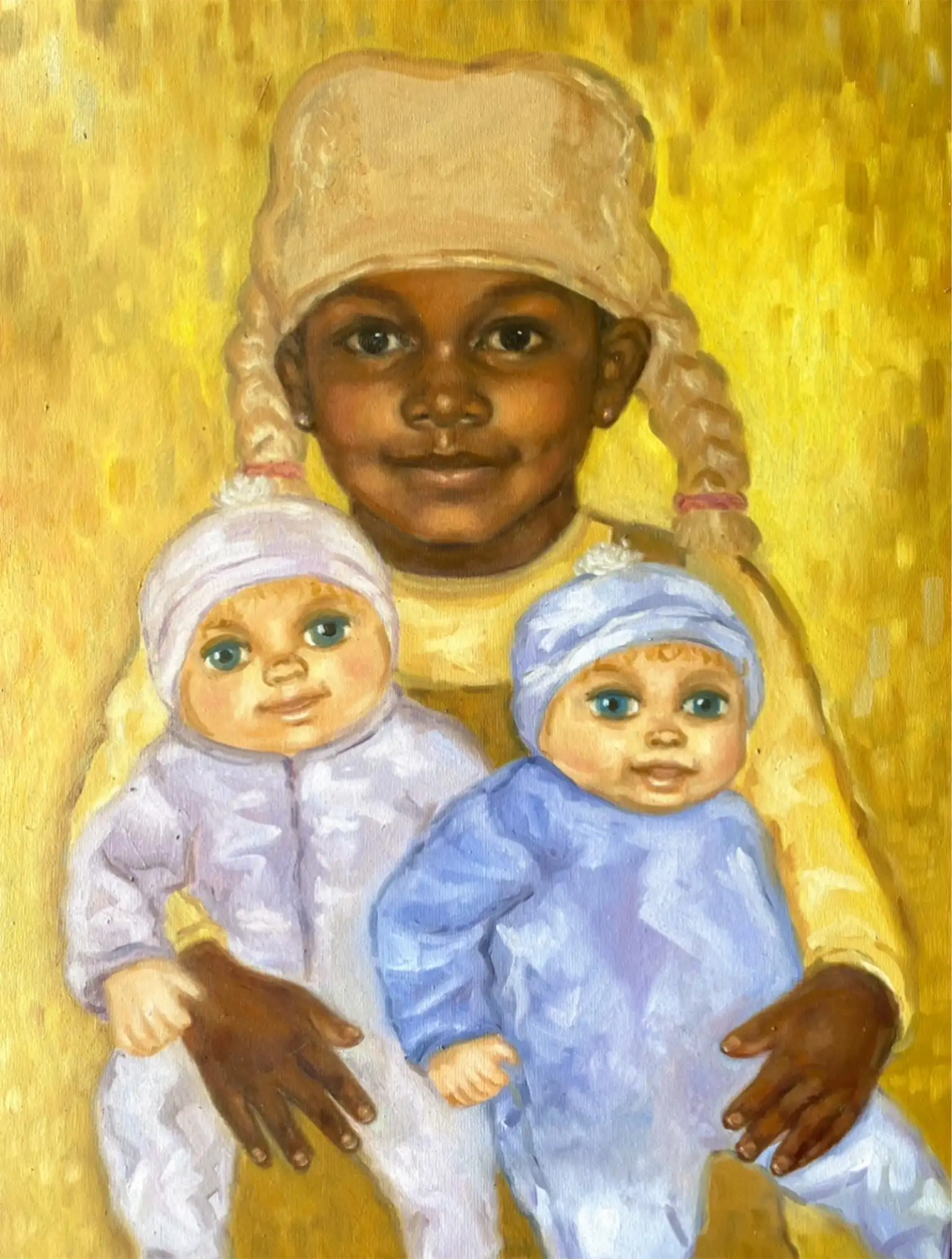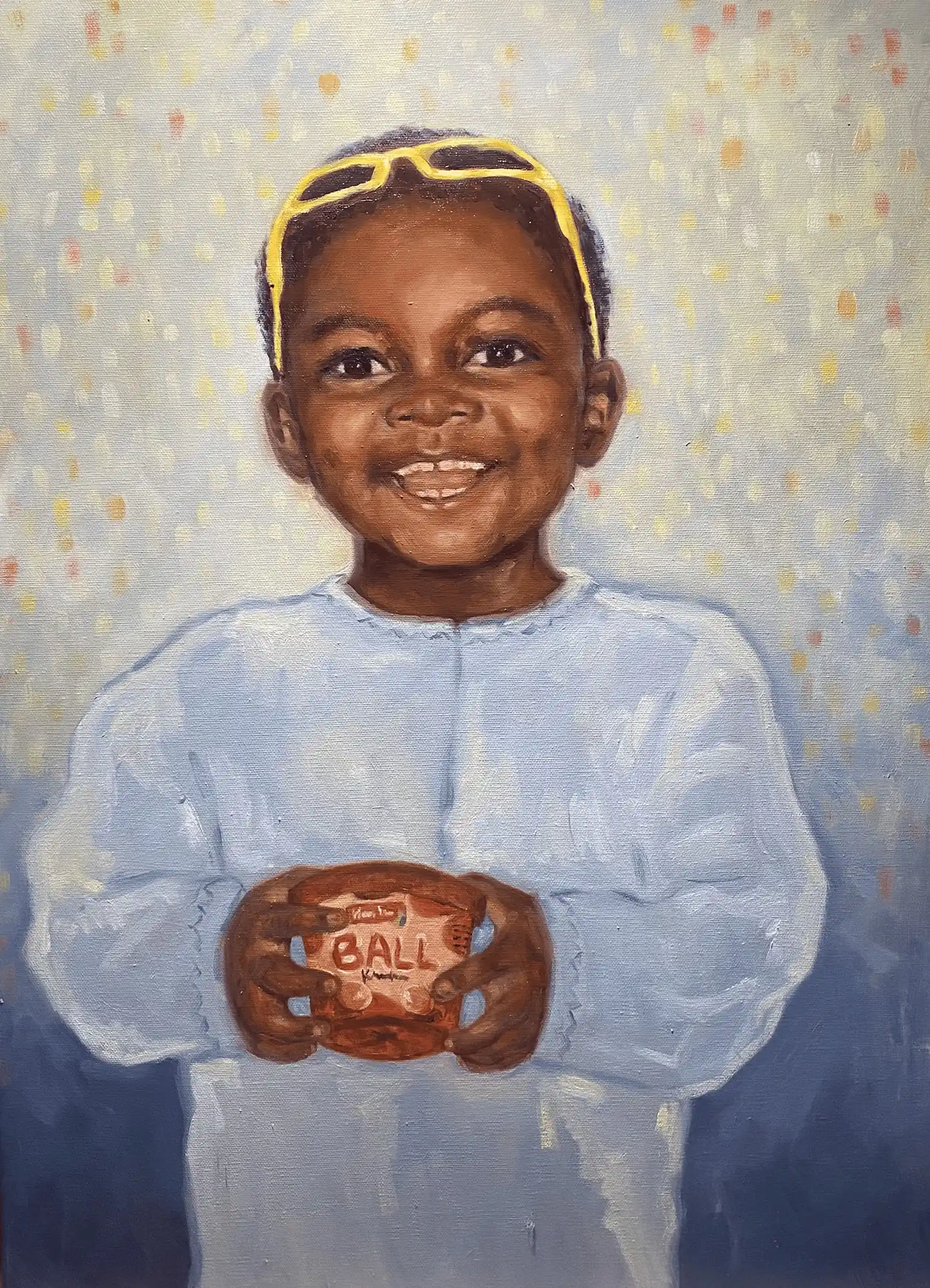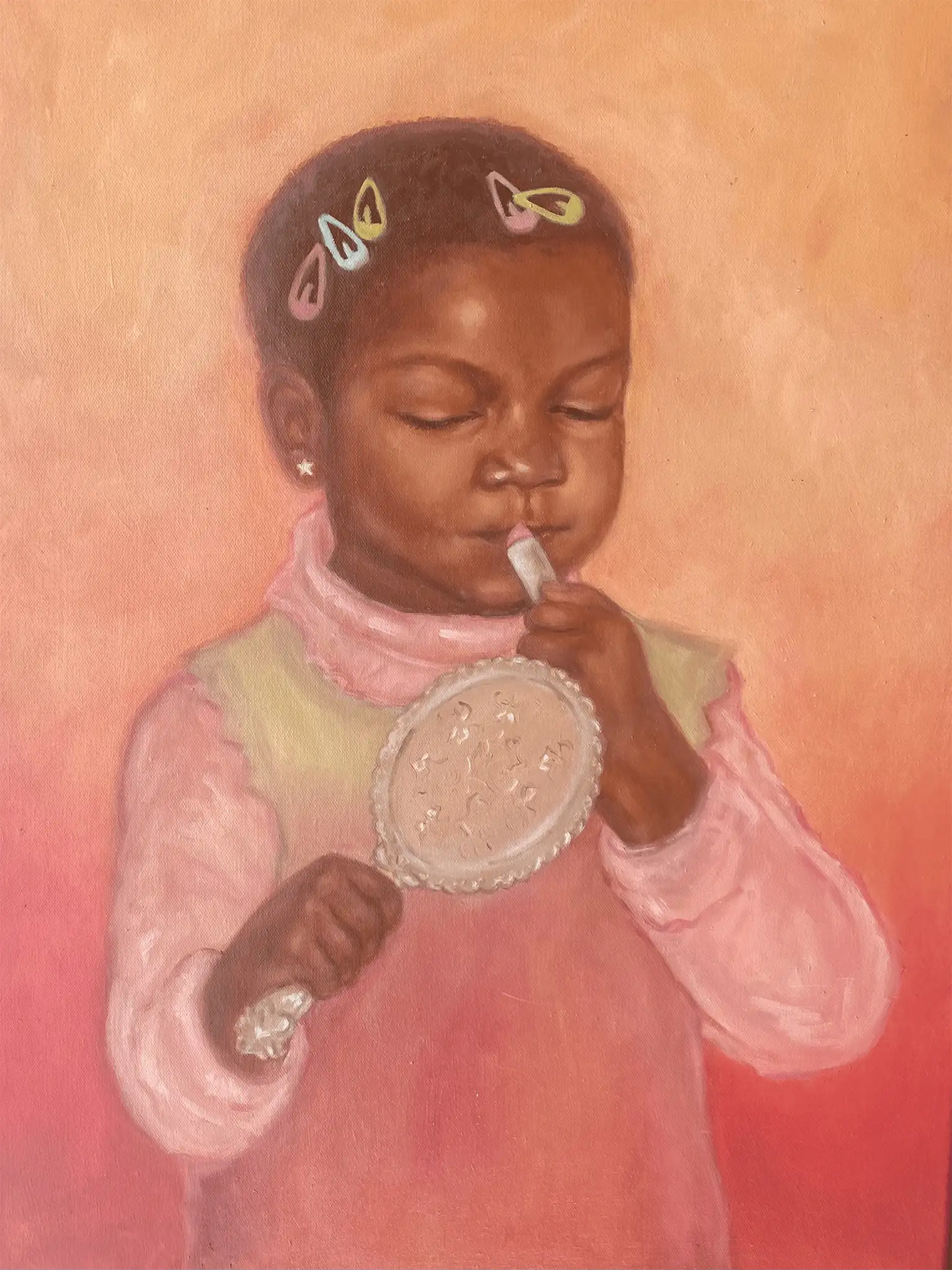 “Enfance” est une série de toiles autobiographiques explorant les questionnements liés à mon identité de petite fille noire souvent confondue avec un petit garçon. À travers cette série, j’examine la manière dont la féminité est une construction sociale qui, dès l’enfance, m’a poussée à surjouer certains comportements pour être reconnue comme telle, alors même que cela n’aurait pas dû être nécessaire. Les œuvres interrogent également les biais racistes auxquels j’ai été confrontée, révélant comment ces normes et perceptions peuvent exclure certaines identités dès le plus jeune âge.