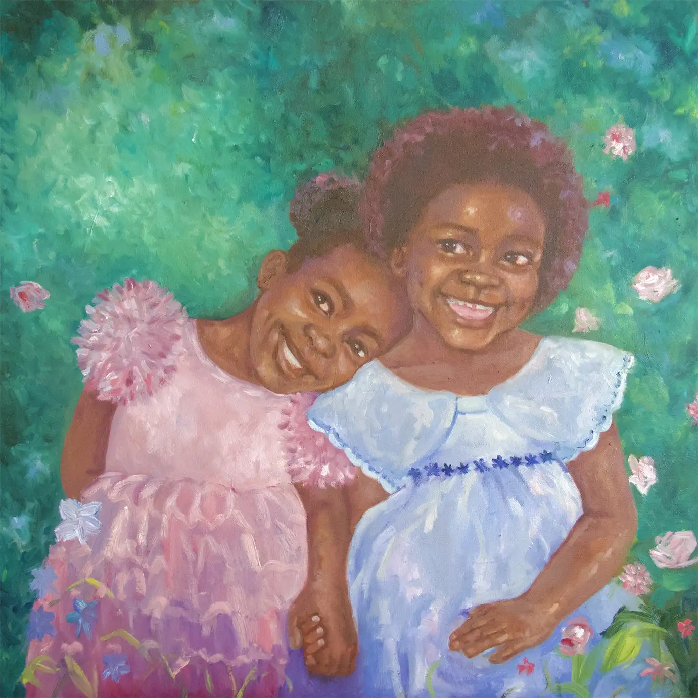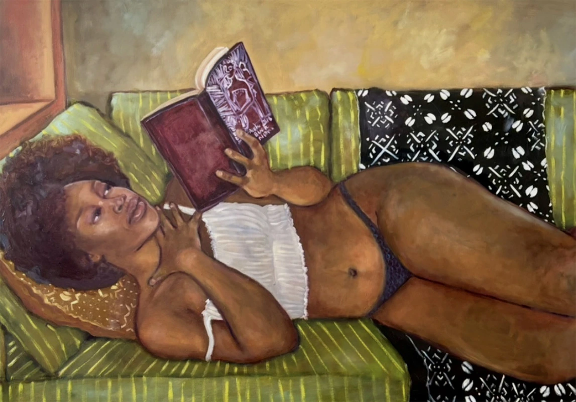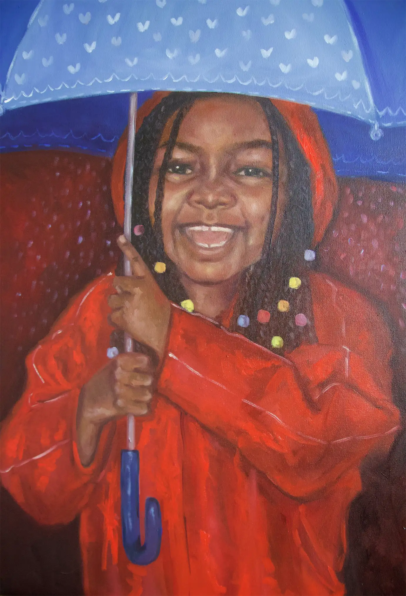 “Enfance” est une série de toiles autobiographiques explorant les questionnements liés à mon identité de petite fille noire souvent confondue avec un petit garçon. À travers cette série, j’examine la manière dont la féminité est une construction sociale qui, dès l’enfance, m’a poussée à surjouer certains comportements pour être reconnue comme telle, alors même que cela n’aurait pas dû être nécessaire. Les œuvres interrogent également les biais racistes auxquels j’ai été confrontée, révélant comment ces normes et perceptions peuvent exclure certaines identités dès le plus jeune âge.