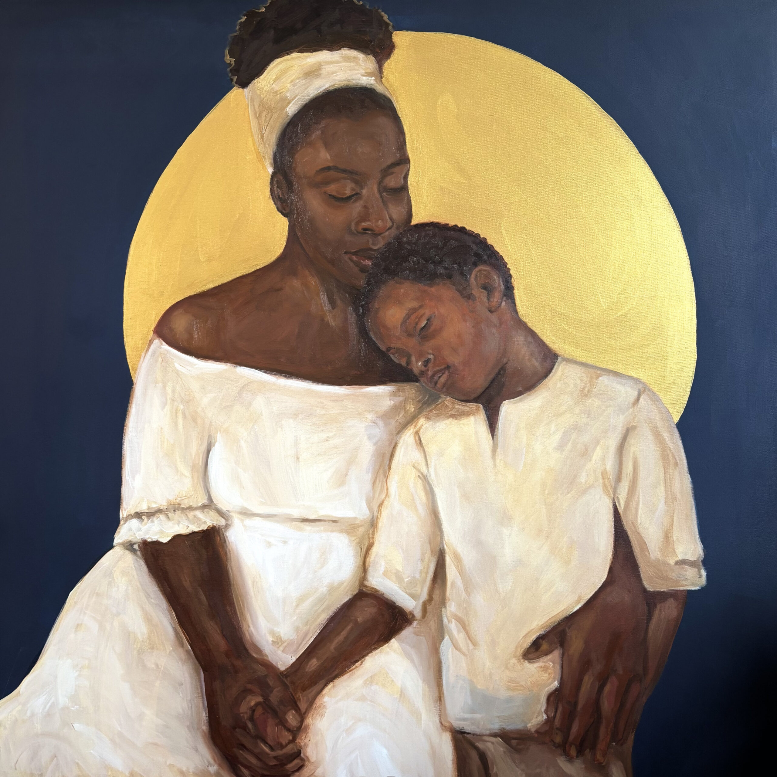 Présentée à l’Association Mémoire d’Outre Mer à Nantes en juin 2024, l’exposition “Demen limyè jayi” est une ode à la révolte et à l’amour. Puisant dans l’héritage révolutionnaire haïtien et nourrie d’un profond attachement aux siens, elle met en lumière la résilience d’un peuple en pleine renaissance, portée par les teintes puissantes du bleu et du doré. Inspirée des icônes byzantines et imprégnée d’une dimension mythologique, cette exposition esquisse les contours d’une nation forte et pérenne, ancrée dans ses racines culturelles et spirituelles.