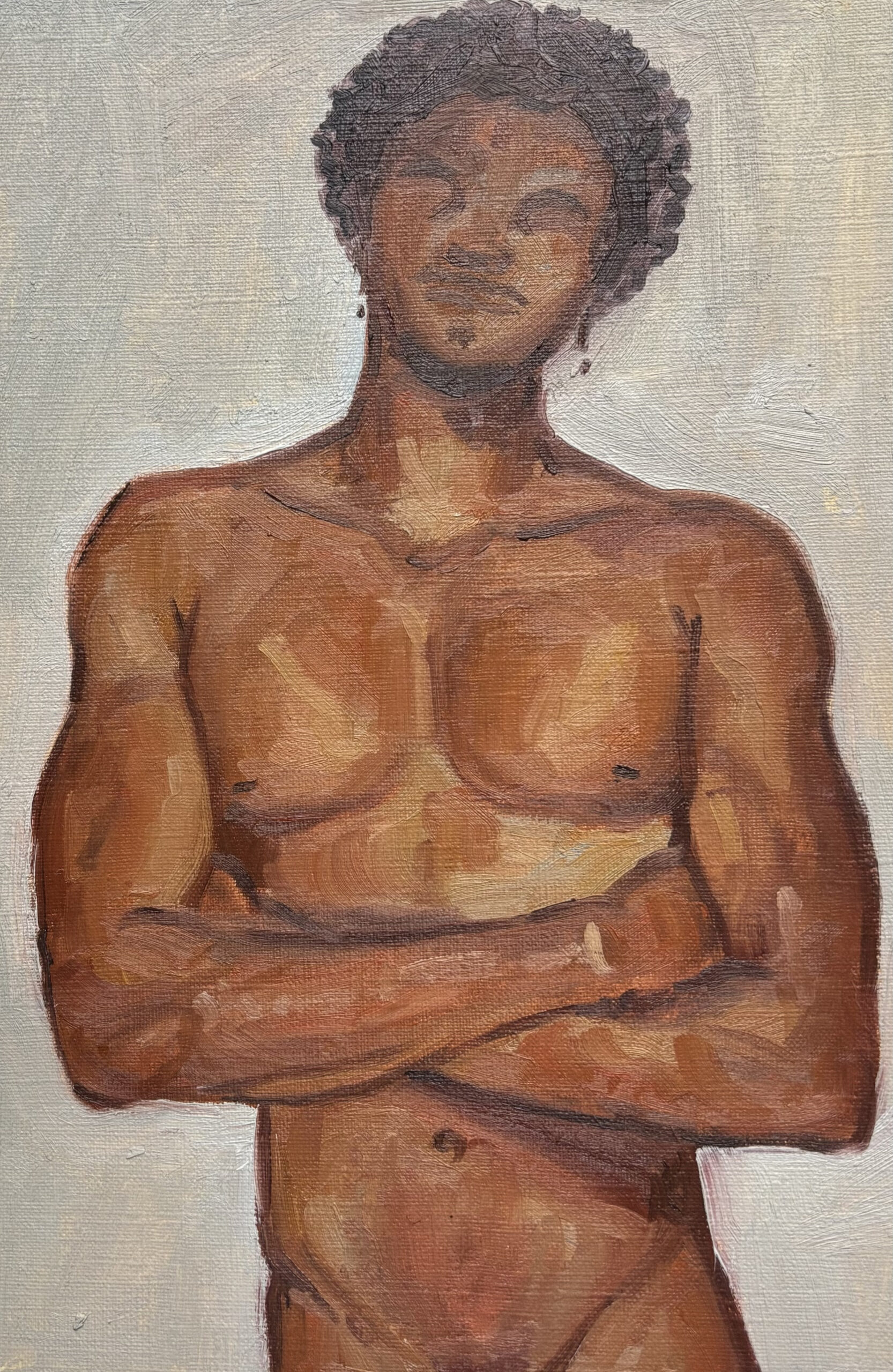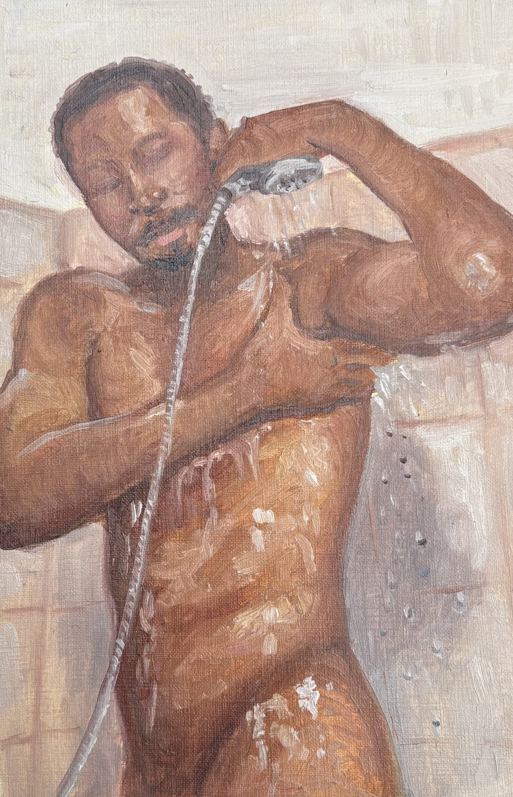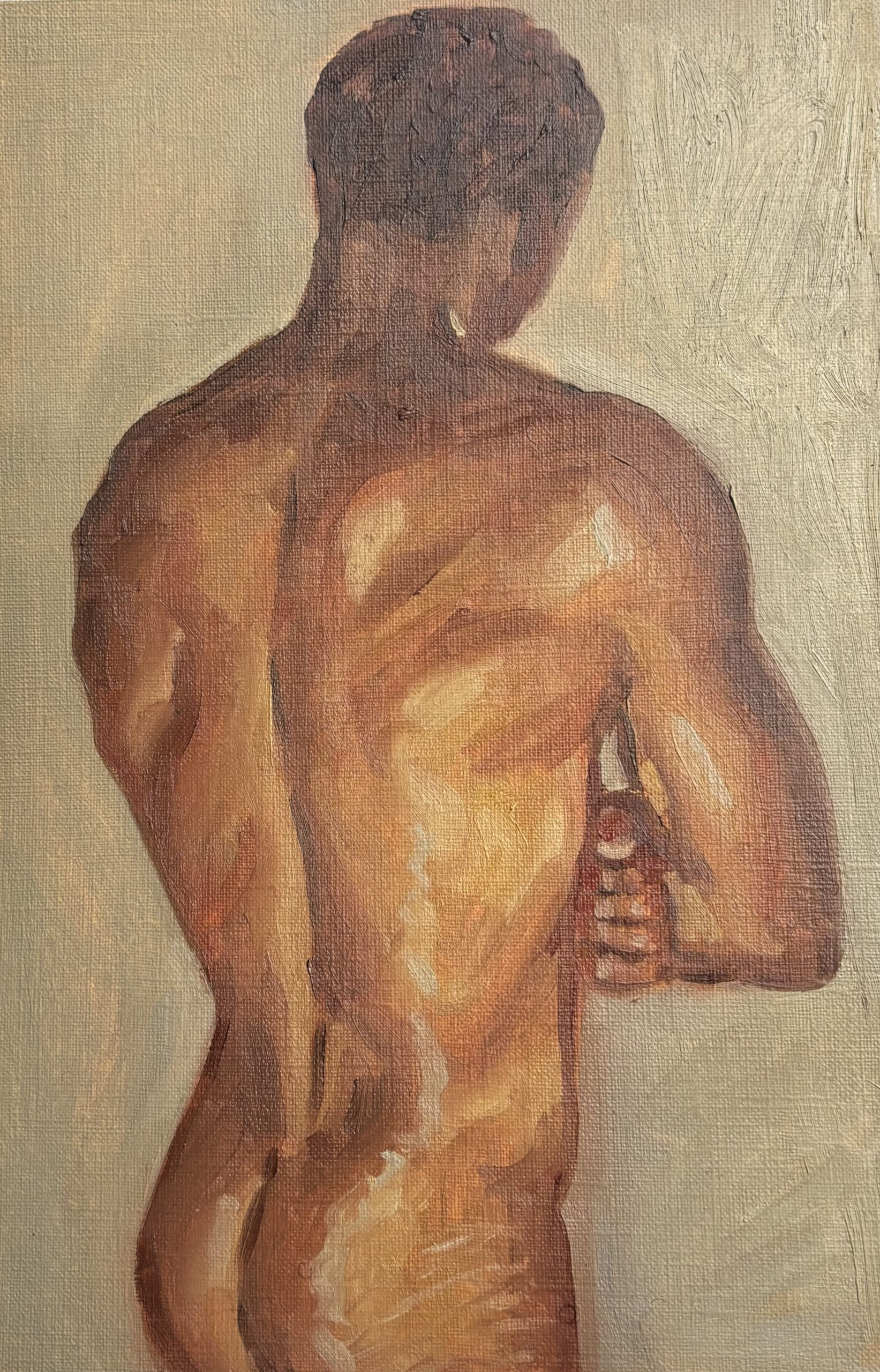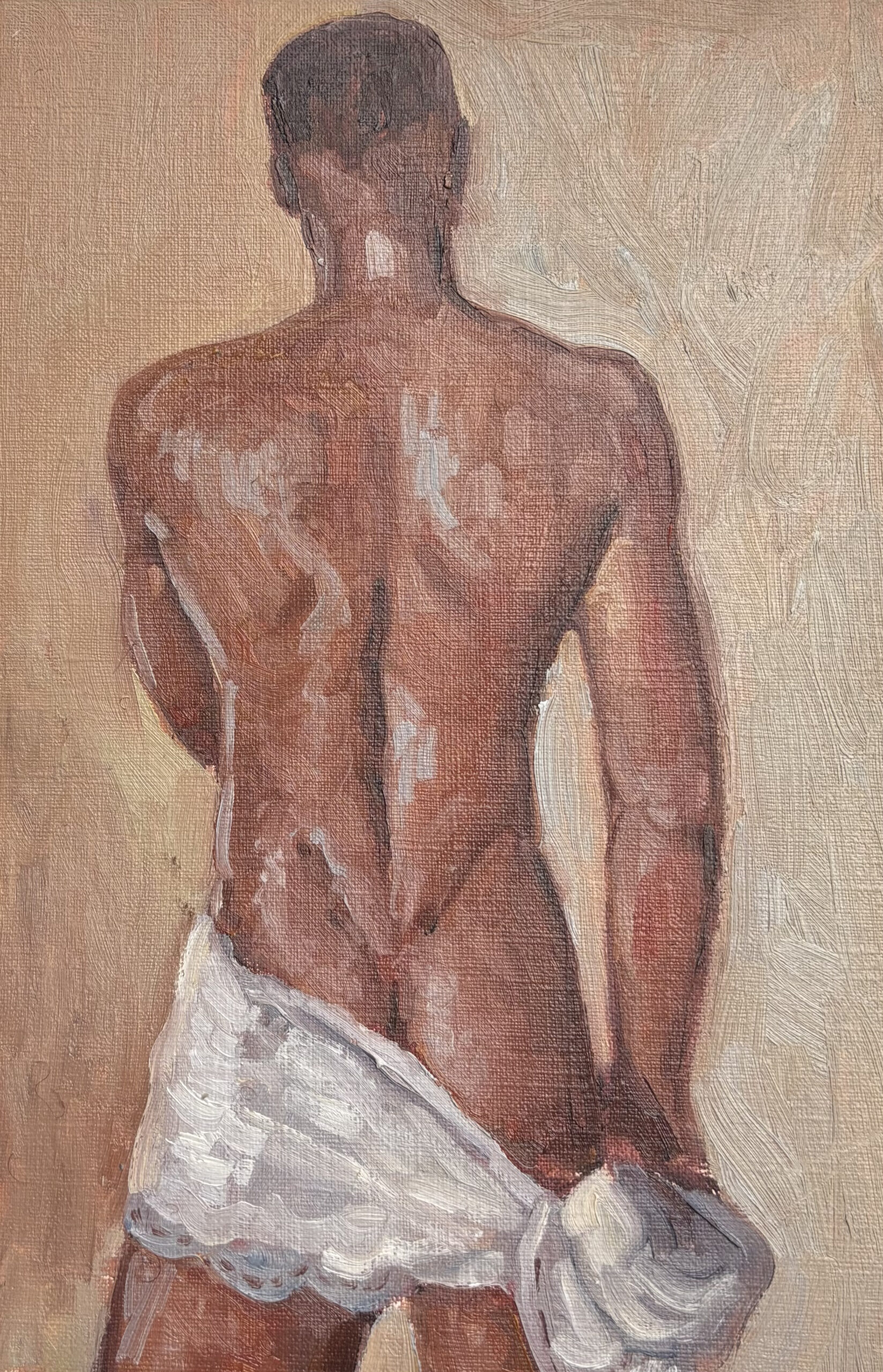 Éros interroge le regard féminin porté sur le corps masculin. À travers des peintures issues de séances photographiques menées par l’artiste, cette série explore le désir, la sensualité et la vulnérabilité des hommes. Loin d’un rapport de domination, il s’agit ici d’un échange : un regard féminin qui choisit, contemple et célèbre.